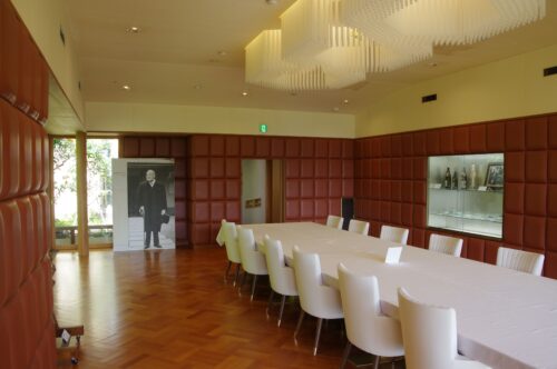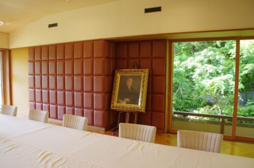 羊の食堂 Nakamura 大磯には吉田茂邸が残ります。 食堂の壁は、羊皮のクッションで覆われています。 ひとつのクッションに一枚の子羊の皮が使われていて その値段は当時の大卒初任給と一月分と同じだったそうです。