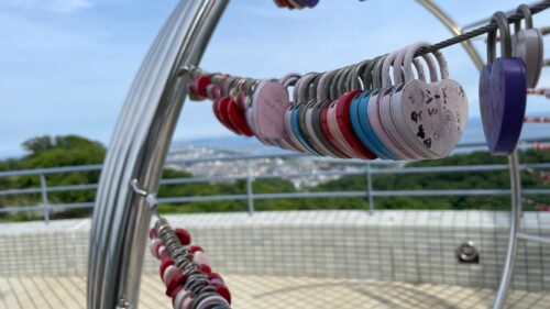 展望台にはハート型の鍵をつけるモニュメントがあり、カップルが記念に